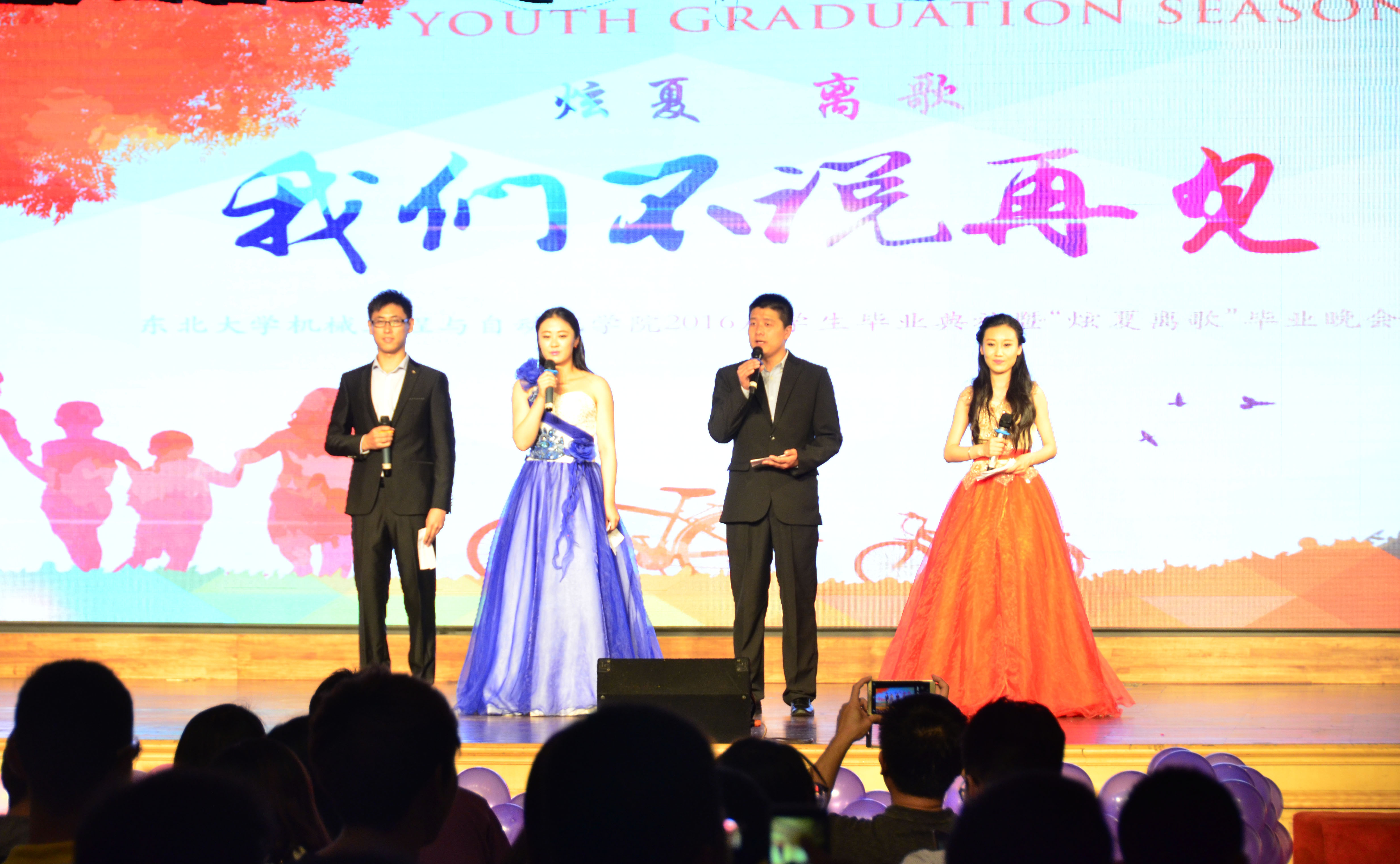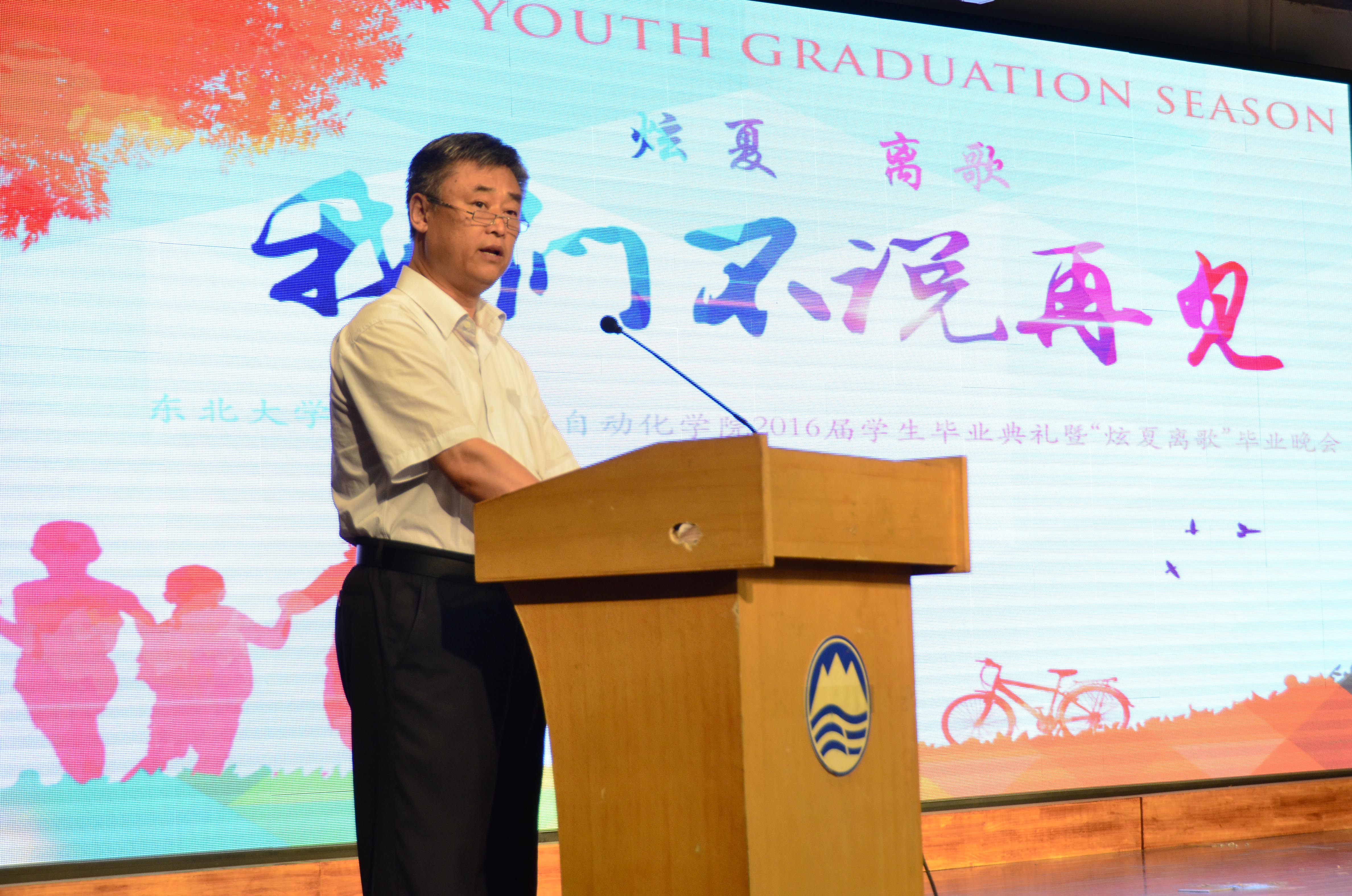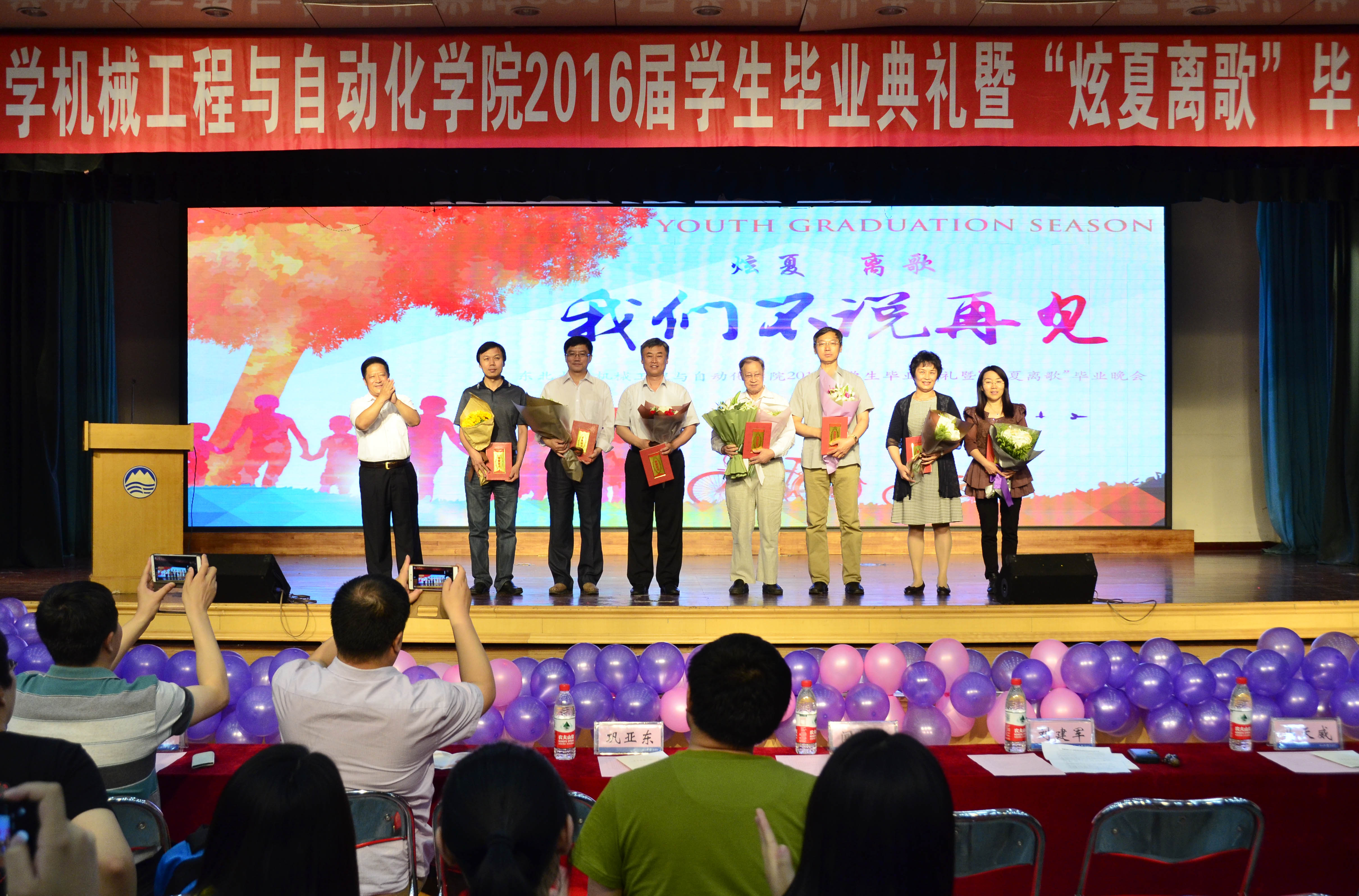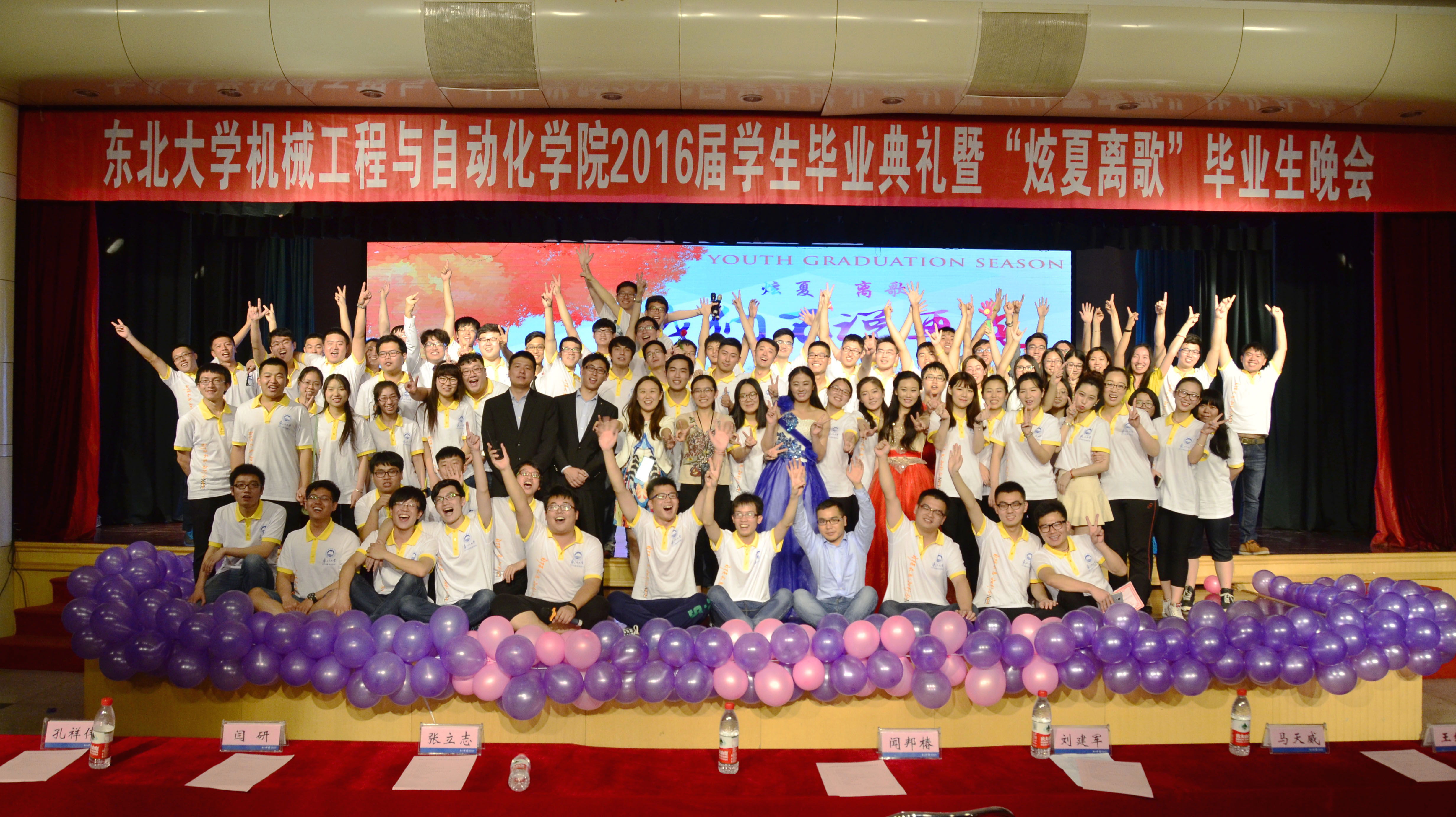 6月15日晚6:00,机械学院在大学生活动中心举办2016届学生毕业典礼暨“炫夏离歌”毕业生晚会。中国科学院院士闻邦椿、东北大学团委书记闫研、学生指导服务中心主任马天威、创新创业学院常务副院长张立志、学生工作处副处长王纯武,机械工程与自动化学院院长巩亚东、党委书记刘建军,副院长孔祥伟、于天彪、李鹤、党委副书记兼副院长田畅、工会主席任朝辉等校院领导、班导师、机械学院第十一届毕业生最喜爱的老师以及部分学生家长应邀出席典礼活动。 毕业典礼首先由机械学院院长巩亚东致辞,感怀四年学生成长、成熟的同时,鼓励学生寻找幸福的真谛,并希望同学们通过学会热爱生活、热爱生命、热爱自己,成为让人羡慕的幸福一代。随后机械学院党委书记刘建军宣读了机械学院2016届获得省、校、院表彰的优秀毕业生、优秀毕业生干部和优秀毕业设计(论文)名单。2016届毕委会主席武继嵩同学宣读了第十一届毕业生最喜爱的老师名单,与会的领导和嘉宾分别给获奖的老师和同学颁奖。随后,闻邦椿院士通过解读习主席讲话,鼓励毕业生要敢于创新、励志成为有理想、有担当的青年一代,并祝愿学院在装备制造业领域乘风破浪,不断创造新的辉煌。最后由毕业生代表李欣妍发言。伴随着激昂的校歌,机械学院2016届学生毕业典礼结束。