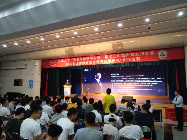 2018年9月14日晚18点30,机械工程与自动化学院在大学生活动中心一楼多功能厅举行东北大学“一五一十”思政文化育人一体化平台建设项目之“青春在砥砺中闪光”2018年基层立业杰出校友报告会暨比亚迪股份有限公司寻找爱迪生2019招聘。东北大学校友、2005届机械电子工程专业硕士研究生,现任比亚迪汽车工业有限公司产品规划及汽车新技术研究院院长杨冬生应邀出席,机械学院党委副书记兼副院长田畅和学院五百余名学生参加了本次报告会。