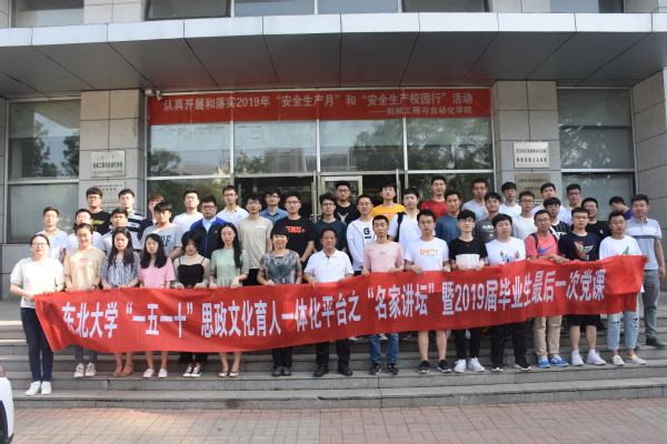进一步加强毕业生思想政治教育工作,培养毕业生党员的爱校荣校情怀,6月19日下午3点在新机械楼513学术报告厅,机械学院举行东北大学“一五一十”思政文化育人一体化平台之“名家讲坛”暨2019届毕业生最后一次党课。机械学院党委书记刘建军受邀为毕业生上党课,机械学院党委副书记兼副院长田畅、2015级本科生辅导员和全体毕业生党员参加了本次活动。