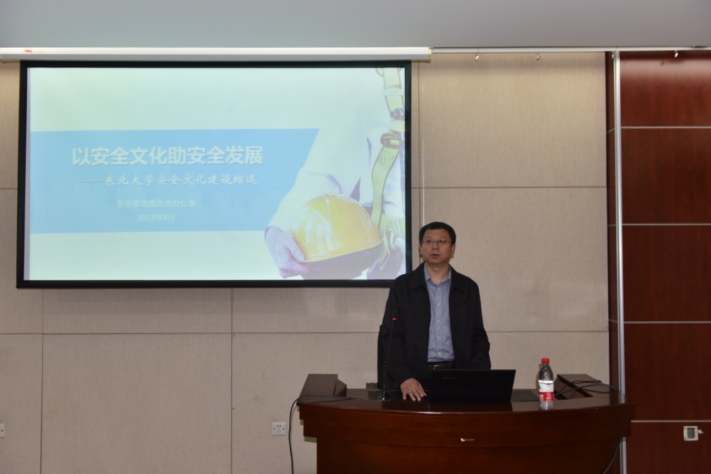 会上,校安委会办公室主任尚子扬就《以安全文化助安全发展——东北大学安全文化建设综述》为主题,进行了一场内容新颖、别开生面的专题报告:分别从“安全管理三个发展阶段 ”、“安全文化的概念及内涵”、“我校安全文化建设初探”三个方面对学校未来安全建设的发展方向和目标进行了阐述和拓展。在历经三年安全管理标准化建设后,学校37个部门和单位的安全管理工作均达标,学校下一步将全面进行安全文化建设,让安全意识、安全行为、安全本质潜移默化融入到全校工作和生活的方方面面,让被动的“要我安全”向主动的“我要安全”过渡,最后形成完善的安全文化建设蓝图:即安全理念集约化、安全制度系统化、安全管理标准化、教育培训立体化、安全行为规范化、安全本质智能化。