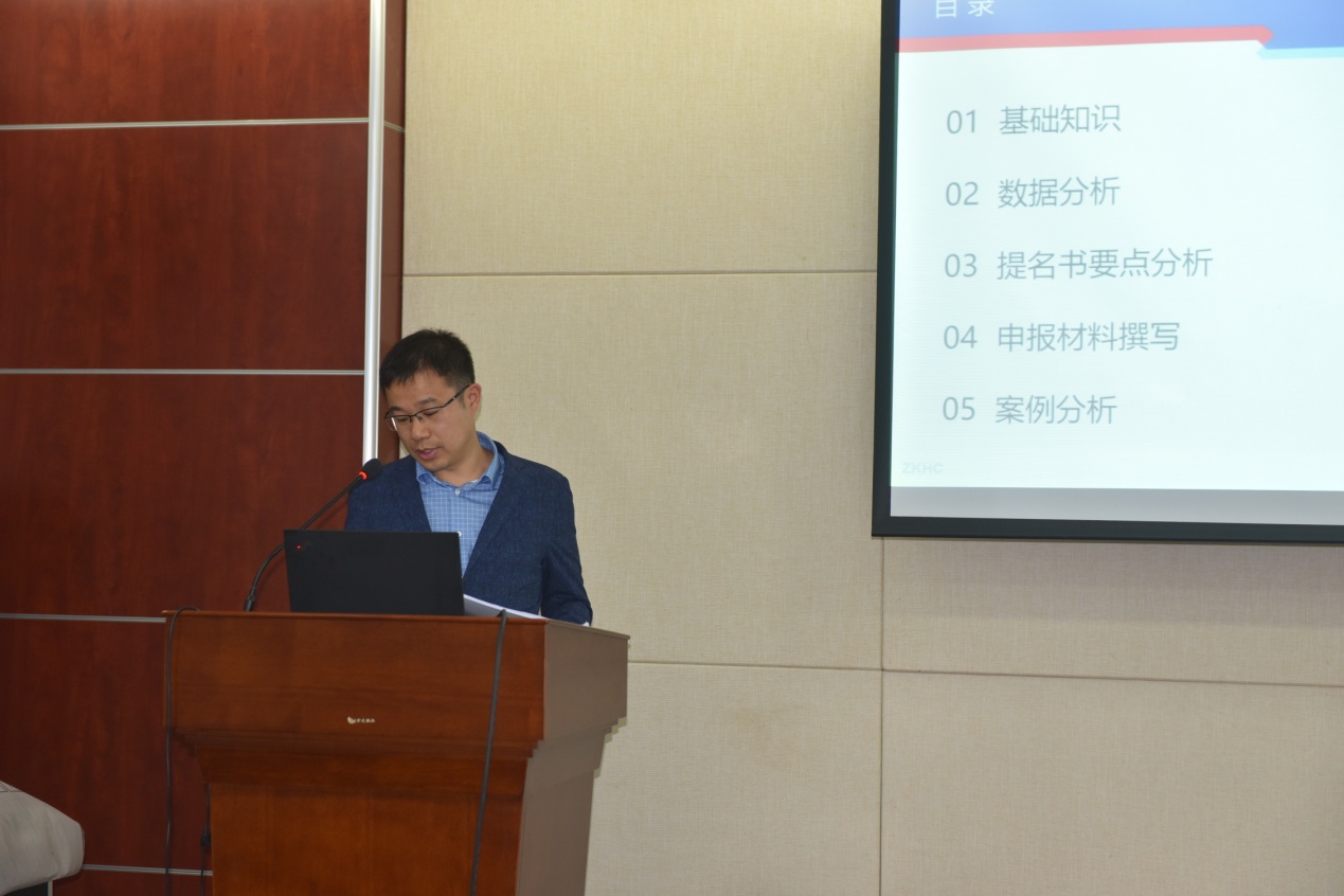 培训会由中科合创宋宇经理主讲,宋宇经理的培训内容主要围绕三大奖的基础知识、数据分析、提名书要点分析及注意事项、申报材料撰写思路与技巧以及典型案例剖析几方面来展开,生动具体的介绍了科技奖励申报中的关键问题,同时与老师们进行互动及交流。
