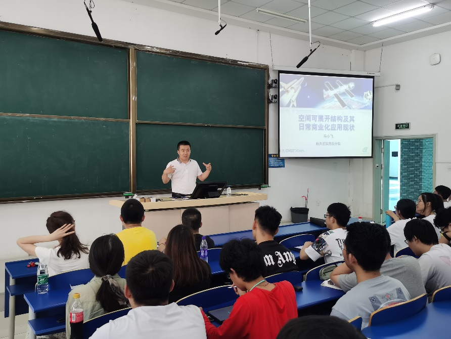 2021年7月1日,应我院邀请,中国航天科技集团五院西安分院空间天线技术研究所副所长马小飞来我院作专题讲座,讲座题目为“空间可展开结构特性分析及日常商业化应用”。马小飞研究员首先介绍了天线结构、太阳翼结构、伸展臂结构等空间可展开结构及其日常商业化的应用现状,然后详细阐述了新型空间天线结构热致动态响应分析,最后扩展了包括结合仿生学、智能材料、超弹性机械材料等新型空间可展开机构的发展方向,并恰逢7月1日悉心讲述了科学研究中的航天精神。讲座内容翔实、层次分明,深受广大师生的欢迎。