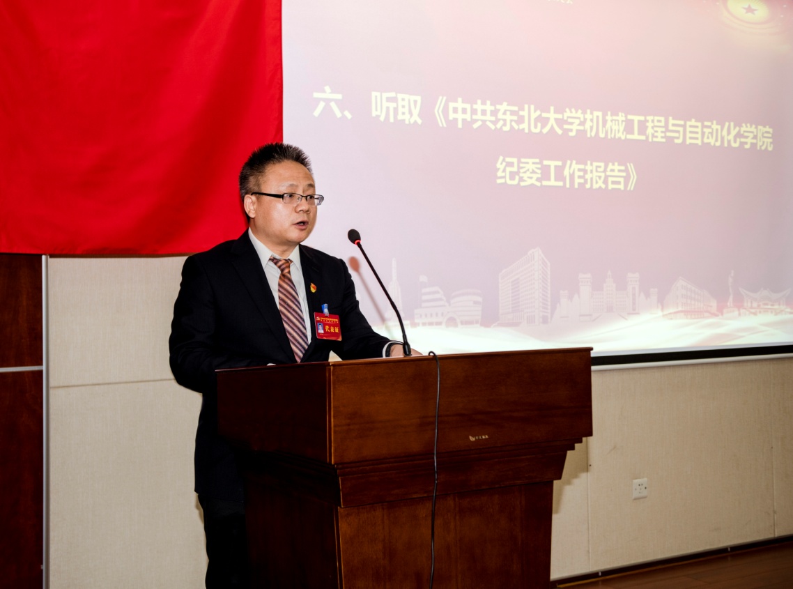 图为:刘坤向大会作《中共东北大学机械工程与自动化学院纪委工作报告》