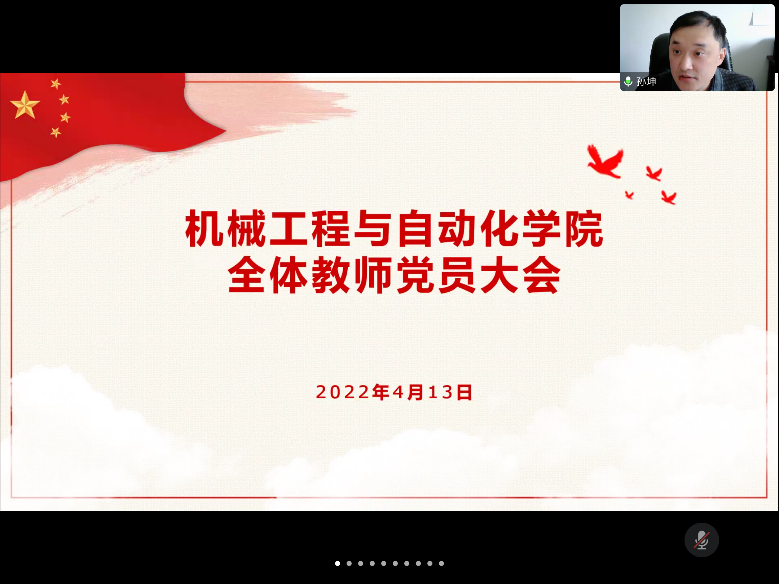 4月13日14:00,机械工程与自动化学院在线上召开全体教师党员大会,学院党委书记刘建军、执行院长于天彪及全体教师党员出席了会议。会议由学院党委副书记、副院长(兼)孙坤主持。