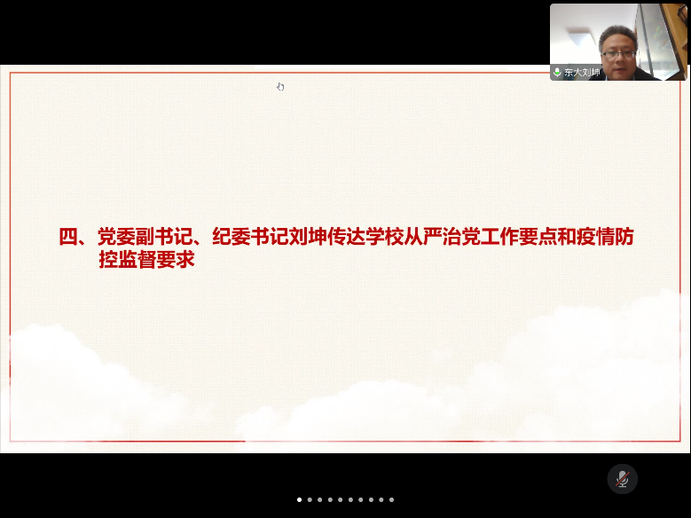 党委副书记、纪委书记刘坤传达了学校全面从严治党工作要点和疫情防控监督要求,希望广大教师提高政治站位,从日常工作出发,加强对基层疫情防控工作的监督。