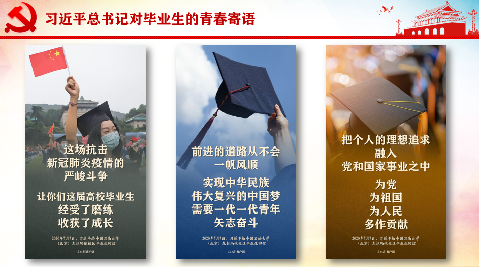 在毕业生党员离校之际上最后一堂党课,一是培养毕业生党员的爱校荣校情怀,提升毕业生的综合素质;二是希望毕业生党员不负韶华,不负时代,不负人民,在青春的赛道上奋力奔跑,争取跑出当代青年的最好成绩!