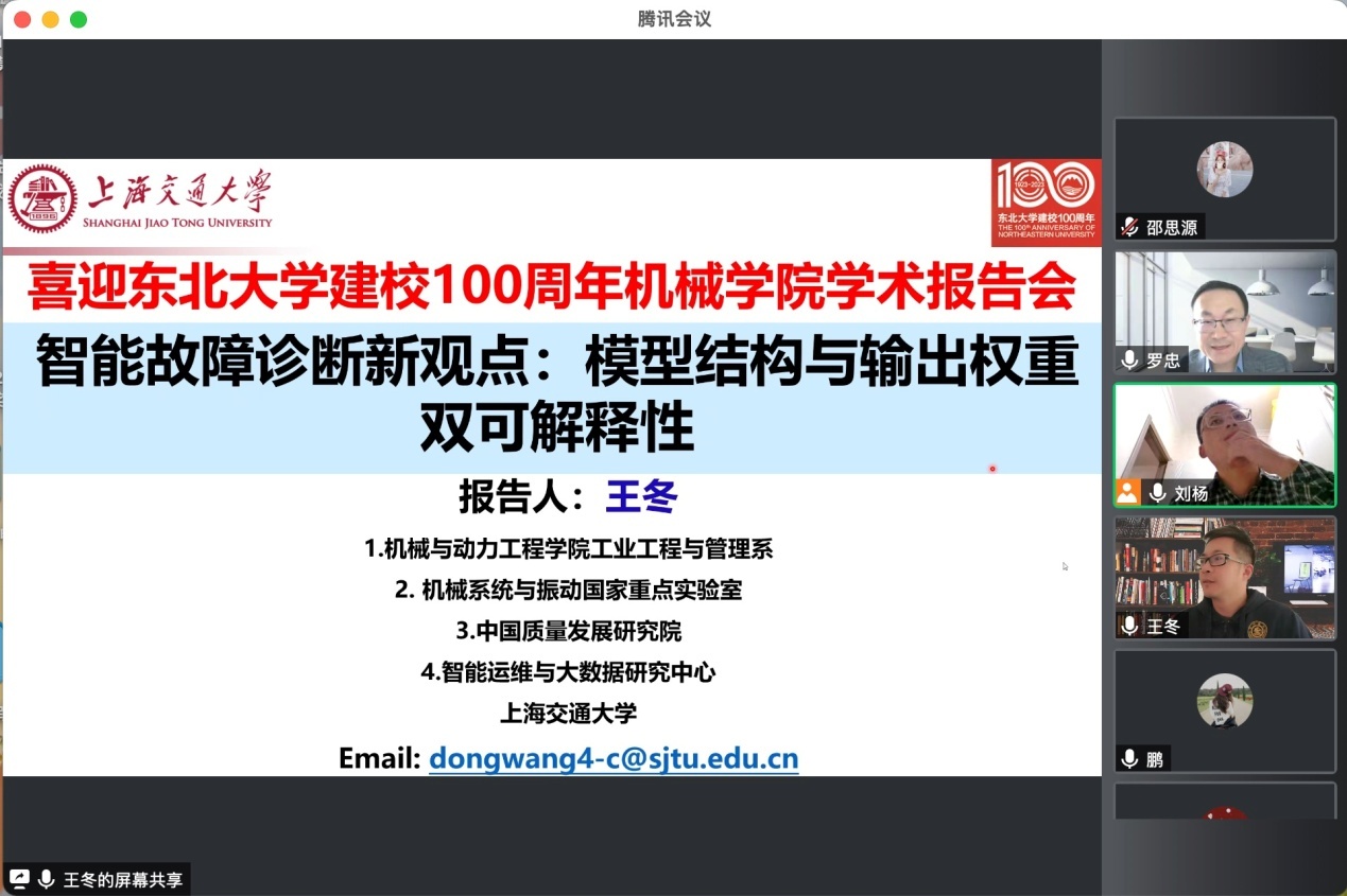 10月12日下午,机械工程与自动化学院“迎接东北大学建校100周年、机械学院建院30周年系列活动之学术报告会”第二场以线上的方式举行,刘杨教授邀请了上海交通大学王冬副教授作学术报告,报告题目为“智能故障诊断新观点:模型结构与输出权重双可解释性”,学院相关专业领域和感兴趣的教师及学生参加了本次学术活动。