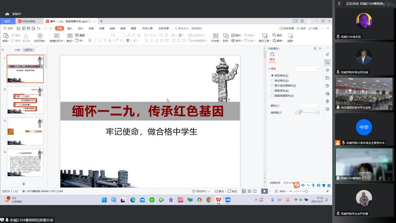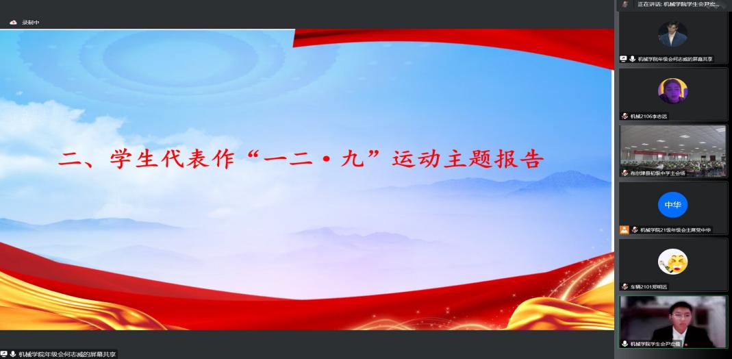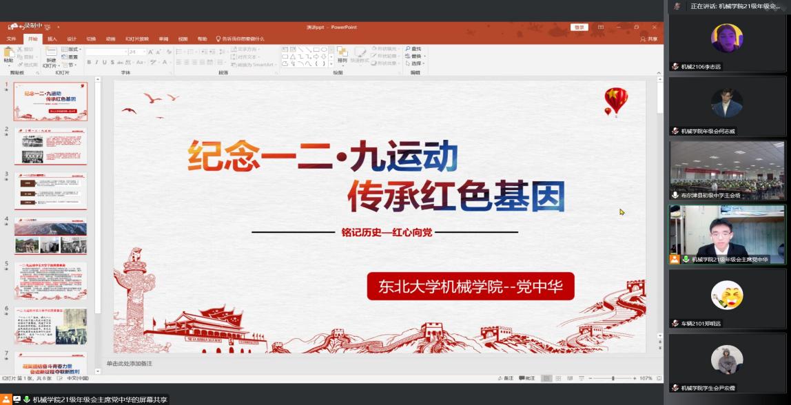 随后,2021级学生代表尹宏儒、党中华和曹雨婷先后就“一二·九运动纪念日”作主题报告。尹宏儒以生动的语言向同学们初步介绍了一二·九运动的起源和发展,并介绍了东北大学学生曾在这场运动中的突出贡献,用精美的图片和详细的陈述与同学们一起回顾了那段激昂的历史岁月。