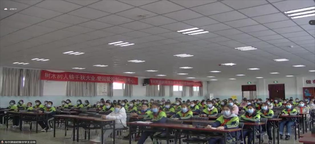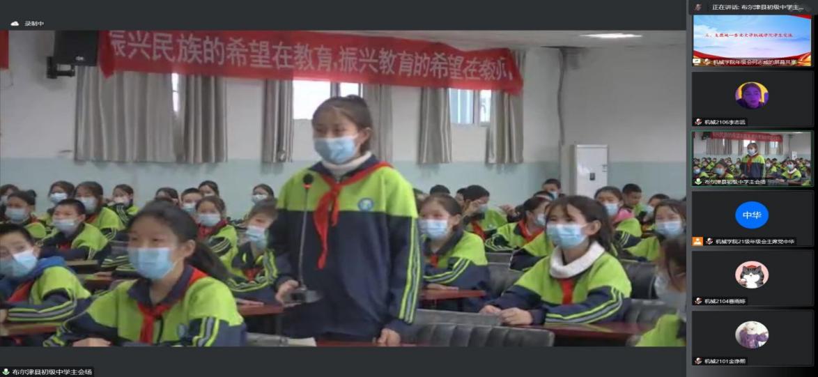 会上,布尔津县的同学们穿着整齐的校服,聆听远程会议。主持人何志威同学用一段话语引出了今天的活动主题。