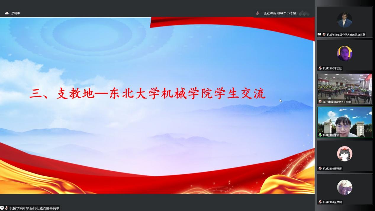 2022年12月5日,东北大学机械工程与自动化学院携手支教团与新疆布尔津县初级中学的同学们通过线上的方式开展了一场远程对话交流活动,东北大学机械学院2021级学生代表向支教地中学学生讲述东大故事。