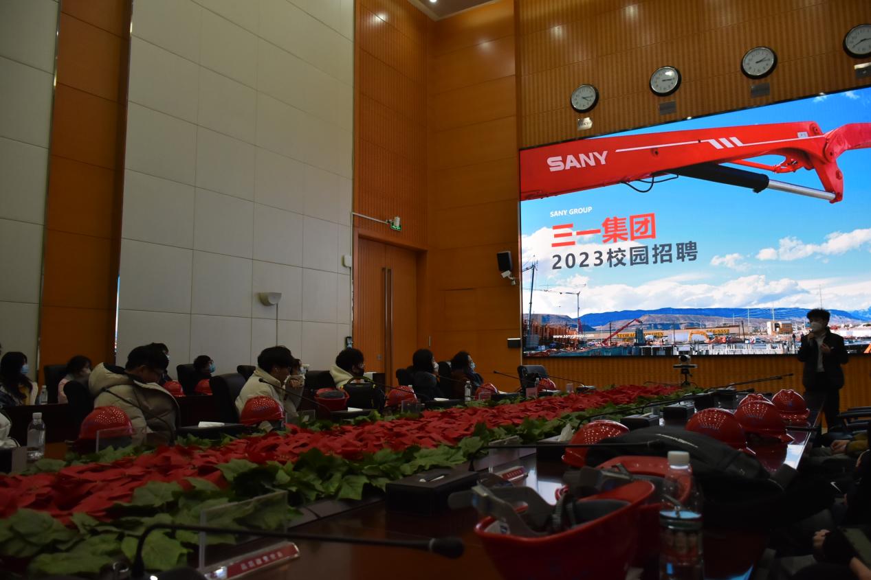 在校园招聘宣讲会上,三一重装人力资源部杨天旭为同学们播放了宣传片,分享了大量的就业信息,提醒同学们要做好就业准备,并详细讲解三一重装经营的业务范围,三一的企业文化以及薪酬待遇。