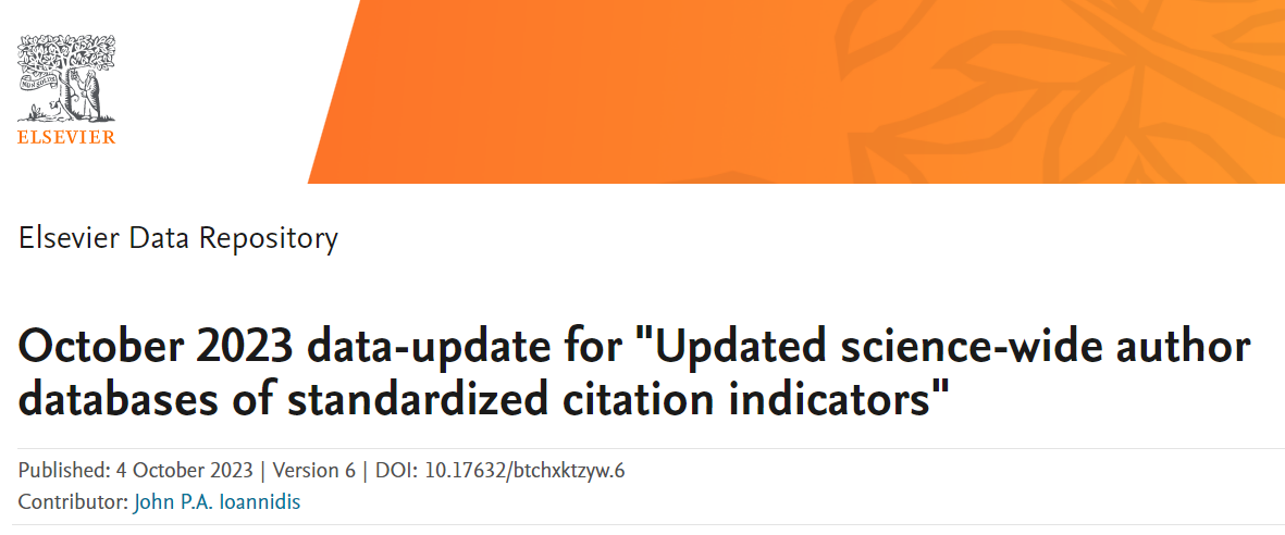 近日,斯坦福大学发布了2023年全球前2%顶尖科学家榜单,并在Elsevier旗下Mendeley Data发布(October 2023 data-update for “Updated science-wide author databases of standardized citation indicators”)。