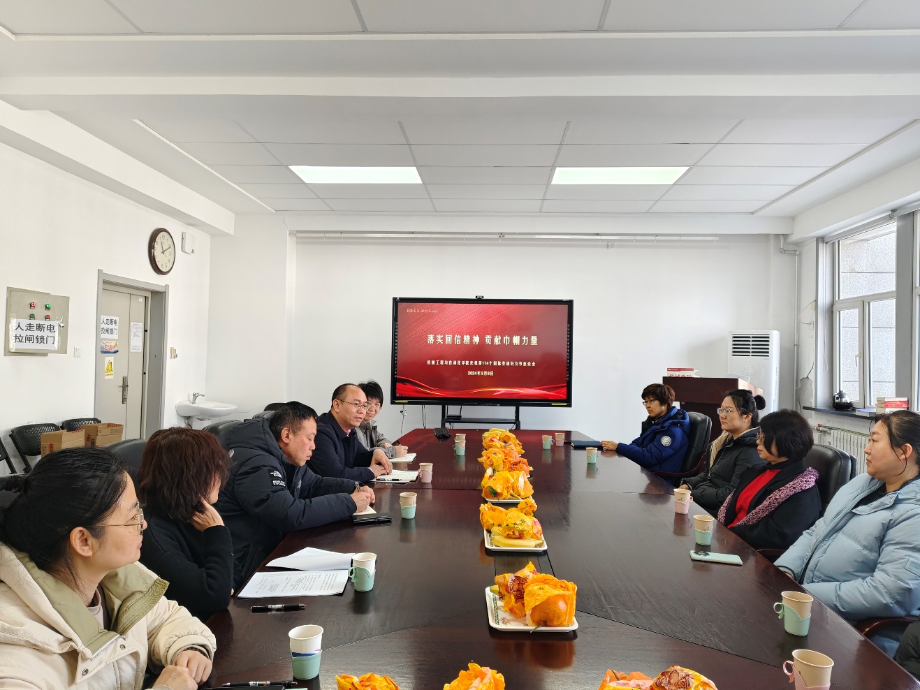 3月8日上午,在喜迎第114个“三八”国际劳动妇女节之际,机械学院在新机械楼206举行以“落实回信精神,贡献巾帼力量”为主题的庆祝“三八”国际劳动妇女节座谈会。学院党委书记李海雄、副院长田畅和女教职工共聚一堂,欢度节日。座谈会由工会主席任朝晖主持。