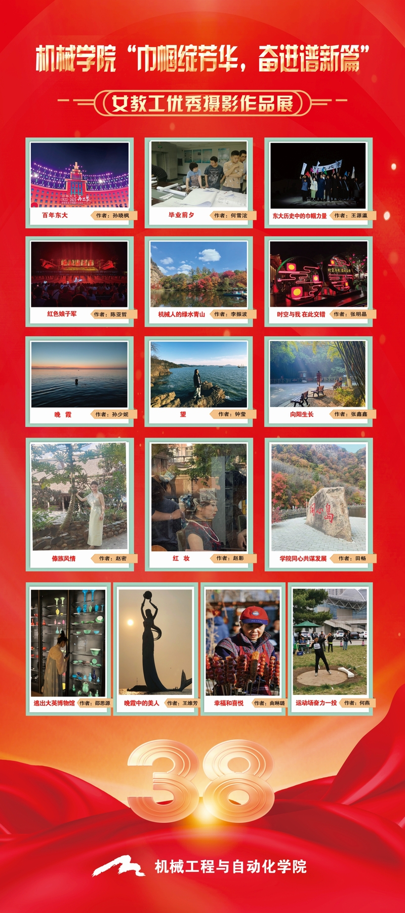 学院女教职工积极参与,围绕家庭生活、祖国山川、百年校庆等主题,提交照片数十张,展示了女教工的巾帼风采。经学院评选,共有十六位女教职工获得优秀摄影作品奖。