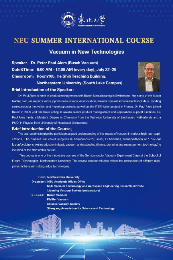 3月起,在东北大学教务处和机械学院的支持下,真空科技与航天工程研究中心负责人与普旭真空进行多次会商,组织并获批了由Peter Paul Alers博士领衔的东北大学暑期国际课程《前沿真空技术》(Vacuum in New Technologies),课程内容涵盖了真空基础理论、真空获得设备及真空测量技术等基础知识,重点介绍了多个密切相关新兴产业和未来产业中真空技术的前沿应用,具体包括半导体、太阳能、锂电池、超级高铁、核聚变/回旋加速器、航空航天等。课程面向全校师生开放,吸引了近百名教师、研究生和本科生参与。