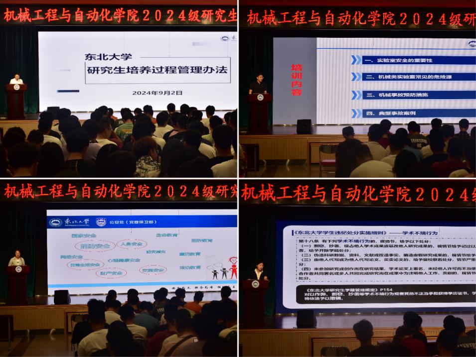 9月2日,机械工程与自动化学院2024级研究生新生入学教育大会在大学生活动中心多功能报告厅顺利举行。学院执行院长于天彪,党委副书记、副院长(兼)孙坤,副院长杨建宇,公安处教育信息科科长宋晓艳,学院学生工作办公室主任郝媛,学院实验中心副主任、实验中心安全负责人谭学飞,学院教学科研办公室副主任邵思源、教学秘书张鑫鑫以及全体2024级研究生新生参加大会。本次大会由研究生辅导员王源瀛主持。