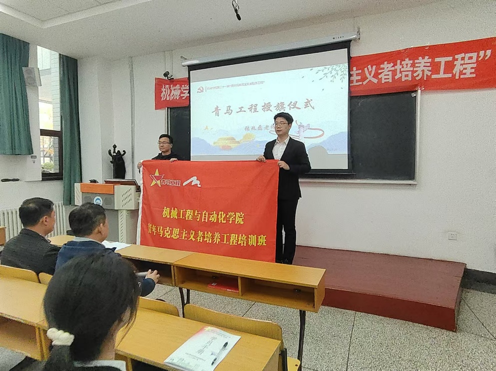 齐唱团歌后,进行神圣的授旗仪式,由校团委副书记张兆磊为东北大学机械工程与自动化学院第二十一期青年马克思主义者培养工程授旗。接过旗帜意味着青马工程的正式开始,这一批东大机械青年又将力担重任,奋力学习马克思主义思想。
