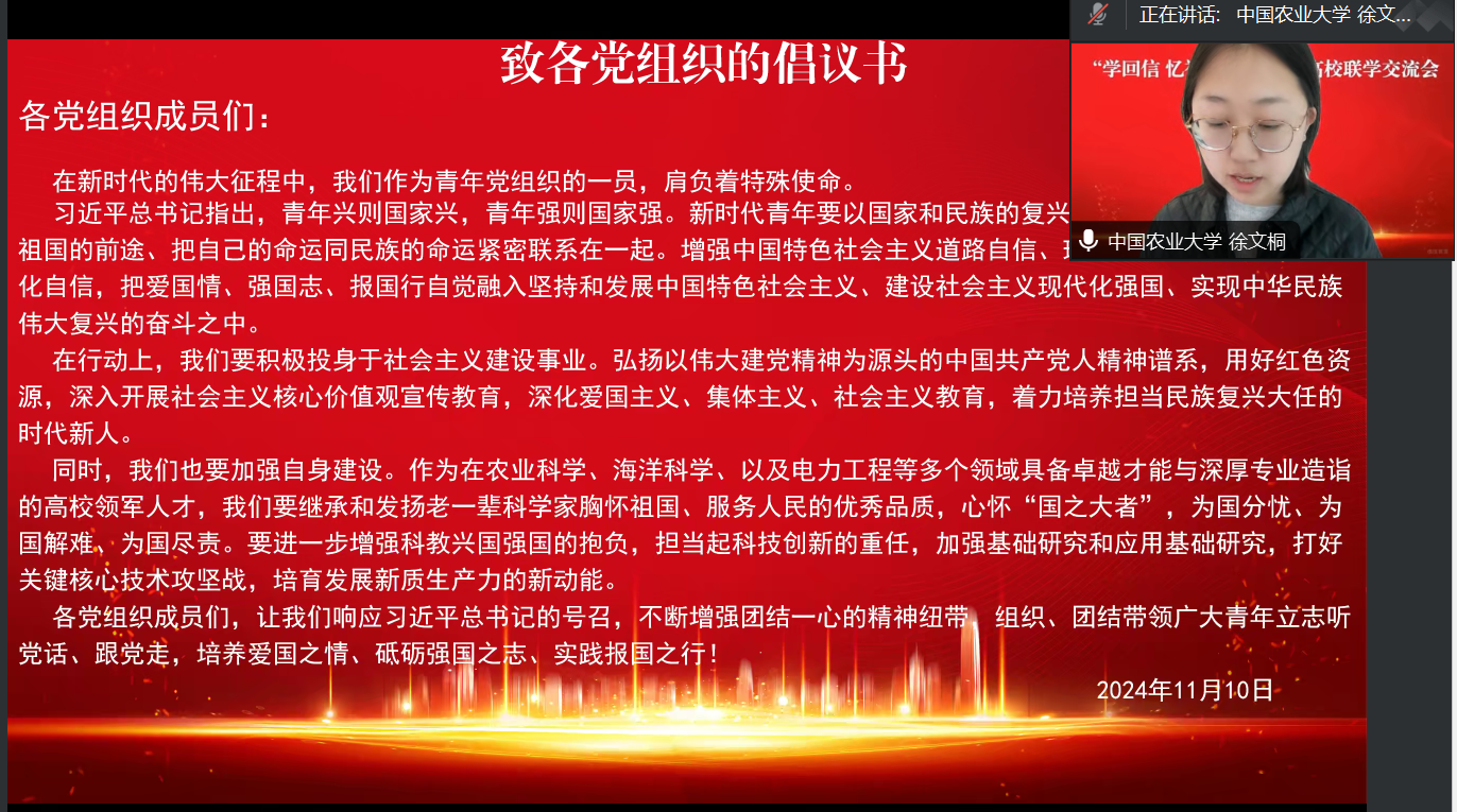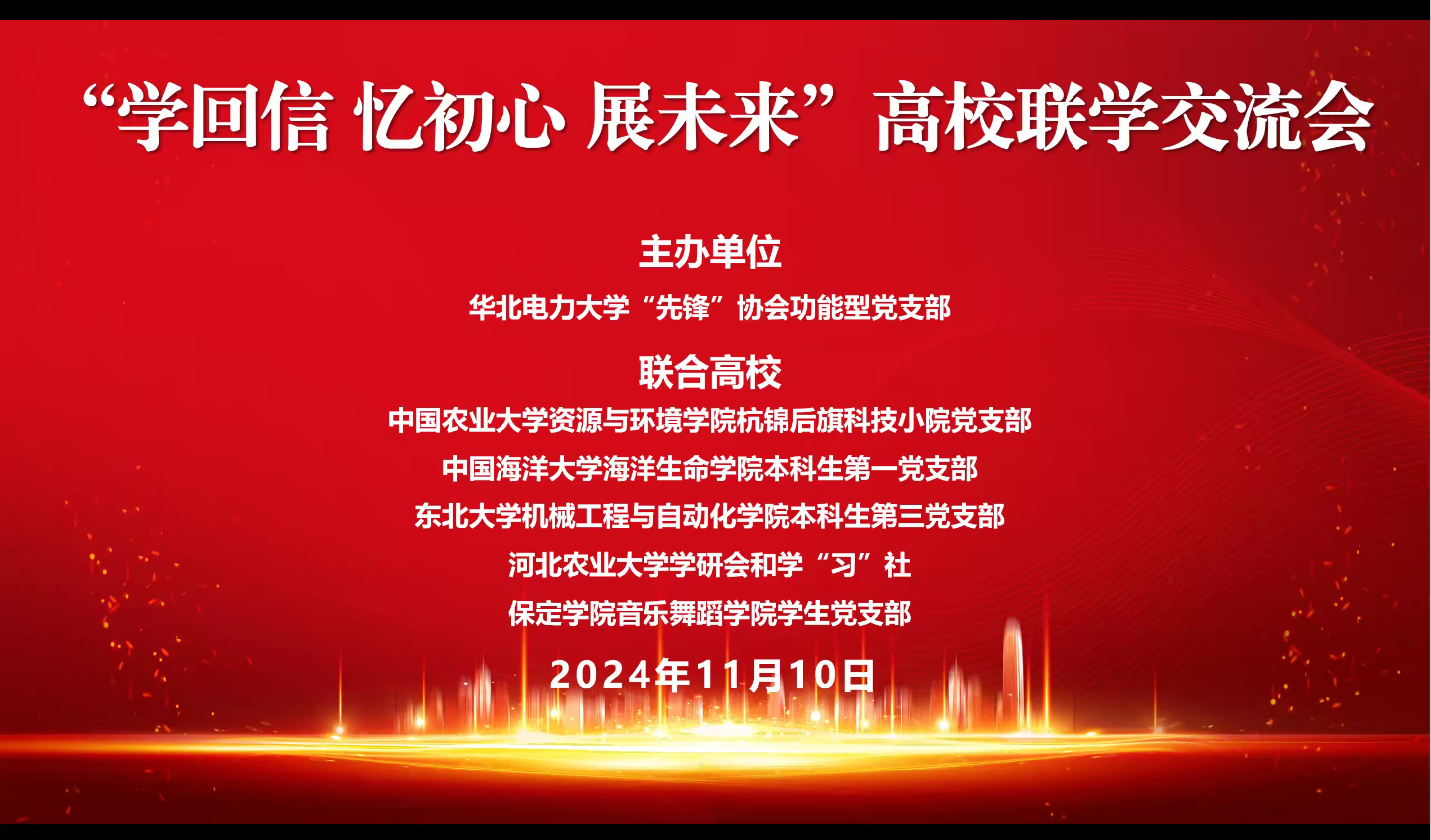 2024年11月10日,东北大学机械工程与自动化学院本科生第三党支部携手中国农业大学资源与环境学院杭锦后旗科技小院党支部、中国海洋大学海洋生命学院本科生第一党支部、华北电力大学“先锋”协会功能型党支部、河北农业大学学研会及学“习”社、保定学院音乐舞蹈学院学生党支部,共同举办了以“学回信、忆初心、展未来”为主题的高校联学交流活动。本次活动旨在深入领会习近平总书记回信精神,激励广大青年学子积极承担时代赋予的光荣使命。
