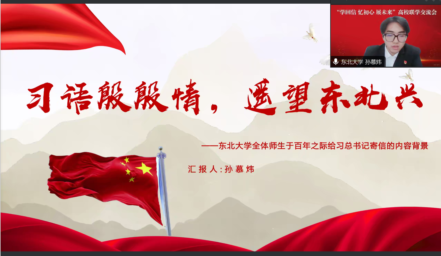 在活动的第一环节,各高校代表依次带领学习总书记回信内容,并对写信背景进行了详细介绍。东北大学机械工程与自动化学院本科生第三党支部的邹爽同志、孙慕炜同志就学习总书记回信精神及写信背景进行了深入阐述,与会人员纷纷表示对习近平总书记对青年一代的殷切期望和嘱托有了更加深刻的认识。