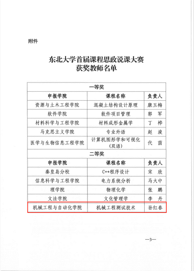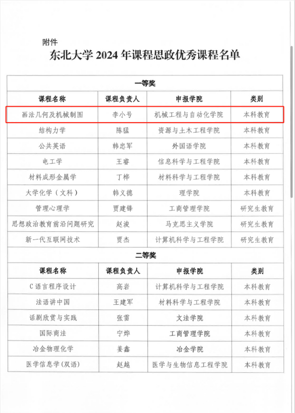 近日,东北大学2024年课程思政优秀课程、校级说课大赛评选结果公布,机械学院共有5位老师获奖。本次活动,经学院推荐、学校评审公示,评选出课程思政优秀课程48门,其中一等奖9个,二等奖11个,三等奖28个。我院教师李小号获一等奖,罗忠、姜曦灼、李翠玲分获二三等奖。校级说课大赛评出一等奖5名、二等奖5名。我院教师孙红春获二等奖。