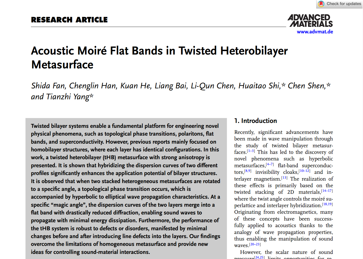 近日,东北大学机械学院杨天智教授联合沈阳建筑大学石怀涛教授团队、美国罗文大学Chen Shen教授团队在“异质双层摩尔超表面”体系相关研究重取得重要突破,相关成果以”Acoustic Moiré Flat Bands in Twisted Heterobilayer Metasurface”。东北大学机械工程学院为第一完成单位,东北大学博士生范世达、韩承霖为共同第一作者,杨天智教授、石怀涛教授和Chen Shen教授为共同通讯作者。东北大学何宽、白亮和哈尔滨工业大学陈立群教授也对论文作出了重要贡献。