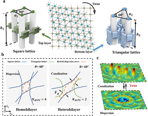 图1|异质双层系统的双曲表面极化。a, 正方形和三角形晶格的示意图、异质双层结构的概念图。b, 同质双层和异质双层的色散曲线杂化图。c, 双曲和椭圆模式之间声场模式的三维可视化。