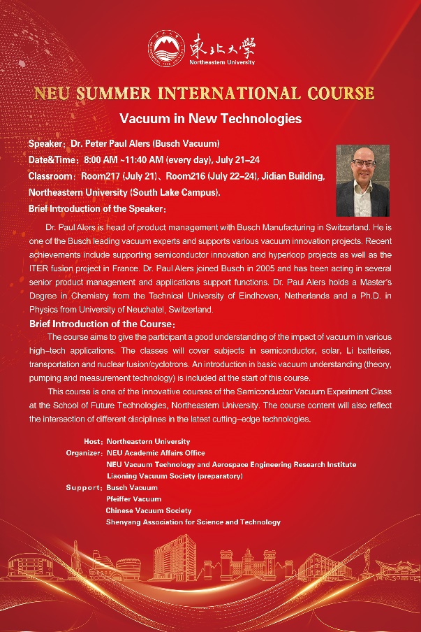 近日,德国普旭集团(Busch Group)总部产品经理Peter Paul Alers博士,普旭中国公司销售总监孙杰先生、人力资源高级经理朱衣女士、渠道管理与市场营销经理方子祥先生一行访问东北大学,成功讲授《前沿真空技术》暑期国际课程,并在东北大学真空科技与航天工程研究中心精心组织下,深入走访了沈阳中北真空技术有限公司(简称“中北真空”)、爱发科真空技术(沈阳)有限公司(简称“爱发科真空”)等本地知名真空企业,深化产教融合与校企合作。