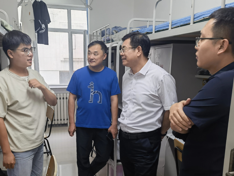 在走访过程中,郝建山、孙坤细致查看宿舍环境与设施配备,逐一询问新生入住体验及生活困难。郝建山与新生亲切交流时强调,研究生阶段需聚焦学术深耕与创新能力培养,建议新生合理规划科研进度、强化体能锻炼与心理调适、筑牢健康安全防线。