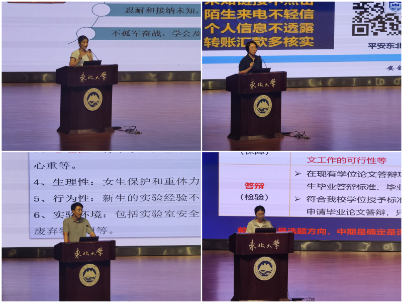 随后,心理健康教育中心吴爽,公安处教育信息科科长宋晓艳,学院实验中心副主任、实验中心安全负责人谭学飞以及教学秘书张鑫鑫分别围绕心理健康教育、研究生校园安全、研究生实验室安全、研究生培养计划及选课等作专题报告。详细介绍了研究生校园学习生活各方面的注意事项,帮助广大研究生新生树立安全意识、提升纪律意识。最后,辅导员孔德辉围绕研究生科研竞赛、未来职业发展以及校规校纪等进行讲解。