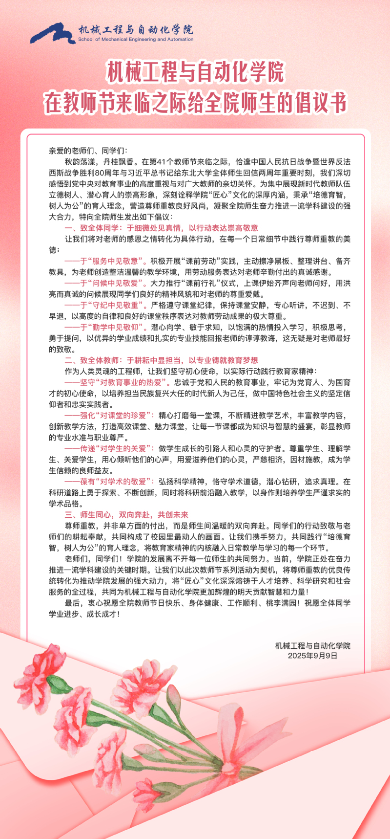 机械工程与自动化学院在教师节来临之际给全院师生的倡议书