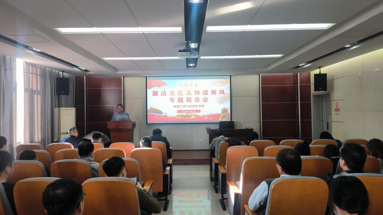 11月18日,机械工程与自动化学院“闻智讲堂”之廉洁文化及师德师风专题报告会在新机械楼513室举行。学校纪律检查委员会办公室副主任夏风云应邀作了题为“深入学习贯彻党的二十届四中全会精神,以廉洁文化和优良师德师风营造风清气正的育人环境”的主题报告。学院党委书记郝建山、执行院长于天彪等全体班子成员、党委委员、纪委委员及各基层党支部纪检委员、各基层组织负责人、部分专任教师、新入职青年教师及新晋级的硕士生导师和博士生导师、博士生代表等共计100余人参加了会议。学院党委副书记、纪委书记刘坤主持会议并传达了学校“廉洁文化月”启动仪式暨“廉洁大讲堂”报告会精神。