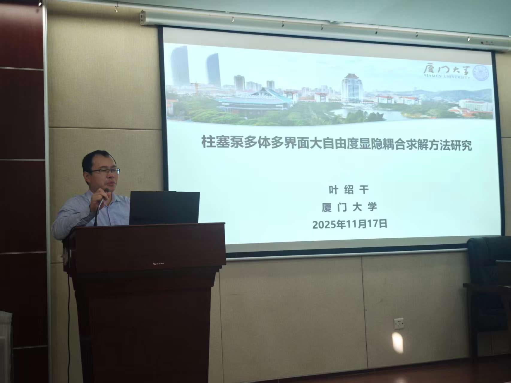 2025年11月17日上午,东北大学机械工程与自动化学院“闻智讲堂”专家学者报告会在南湖校区新机械楼513会议室成功举办。本次报告会特邀厦门大学特任研究员、博士生导师叶绍干作题为《柱塞泵多体多界面大自由度显隐耦合求解方法研究》的学术报告。学院相关领域师生踊跃参加了此次学术活动。