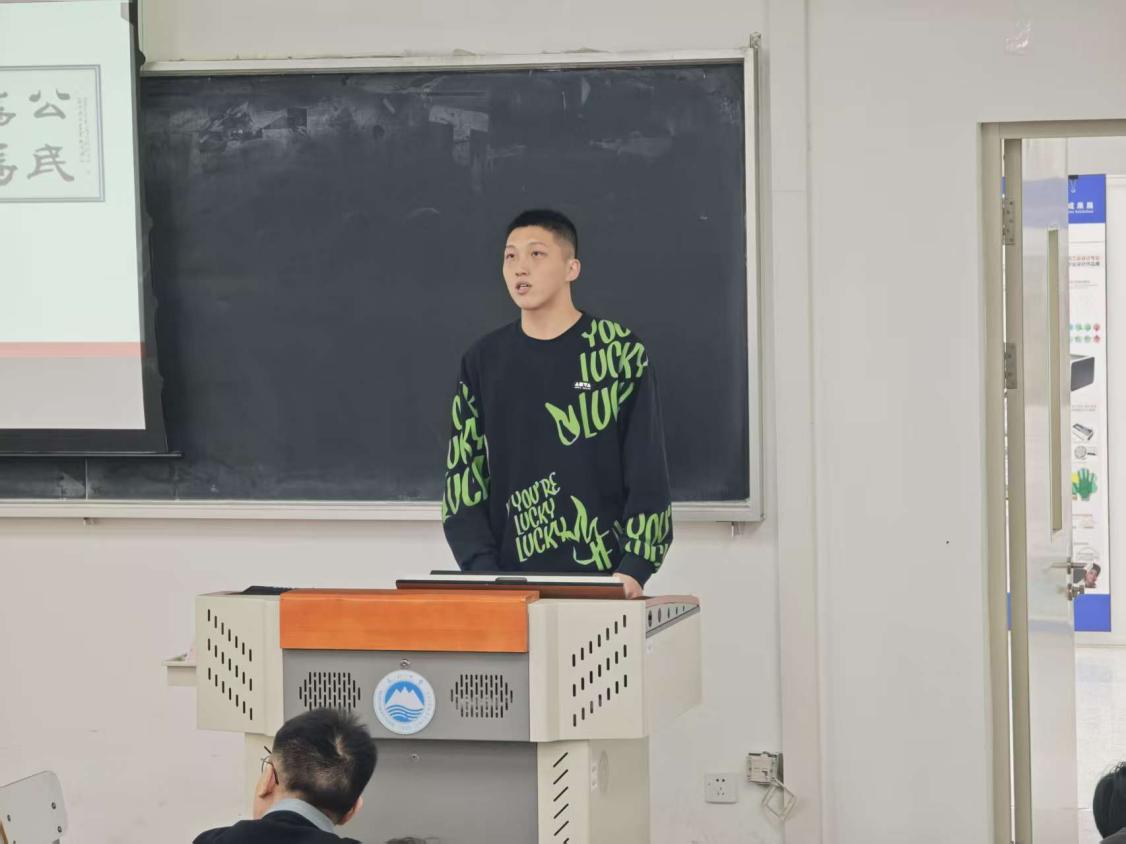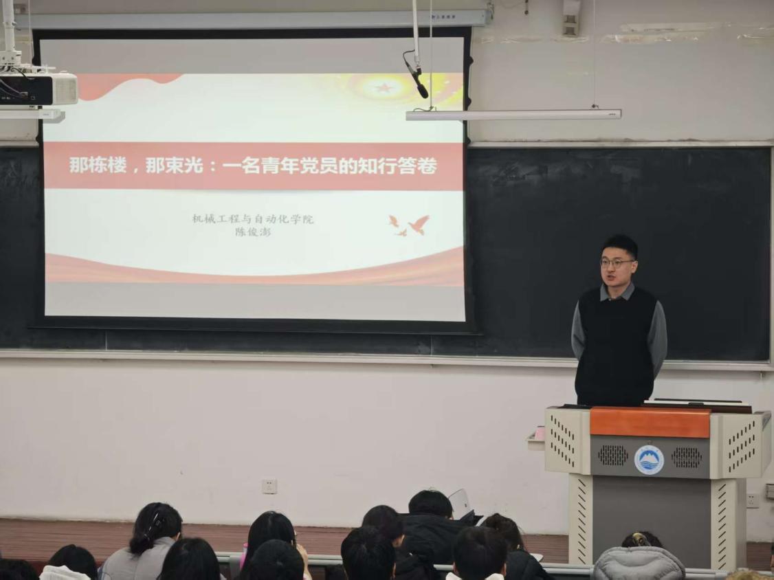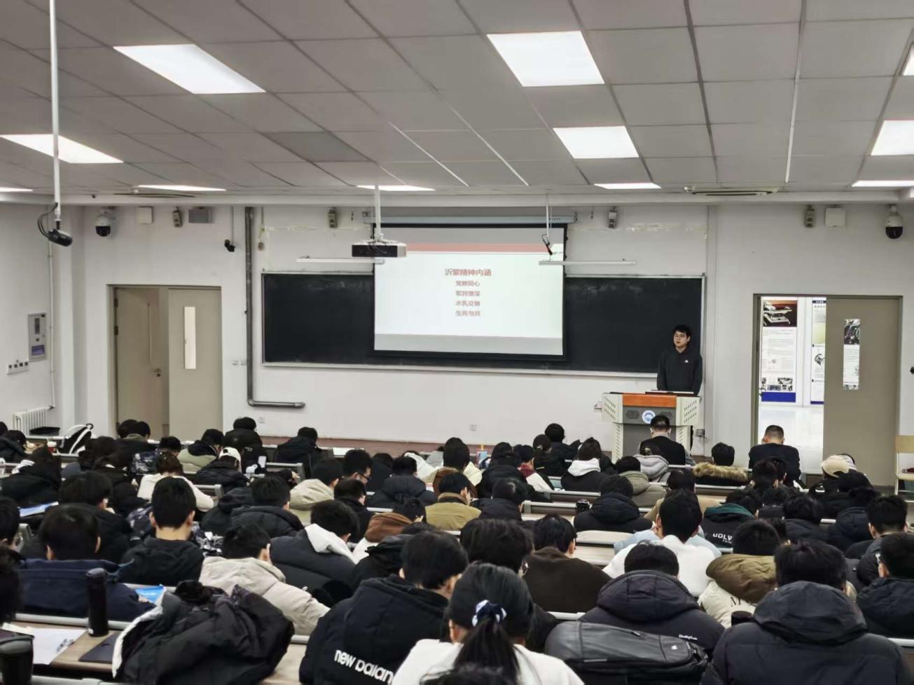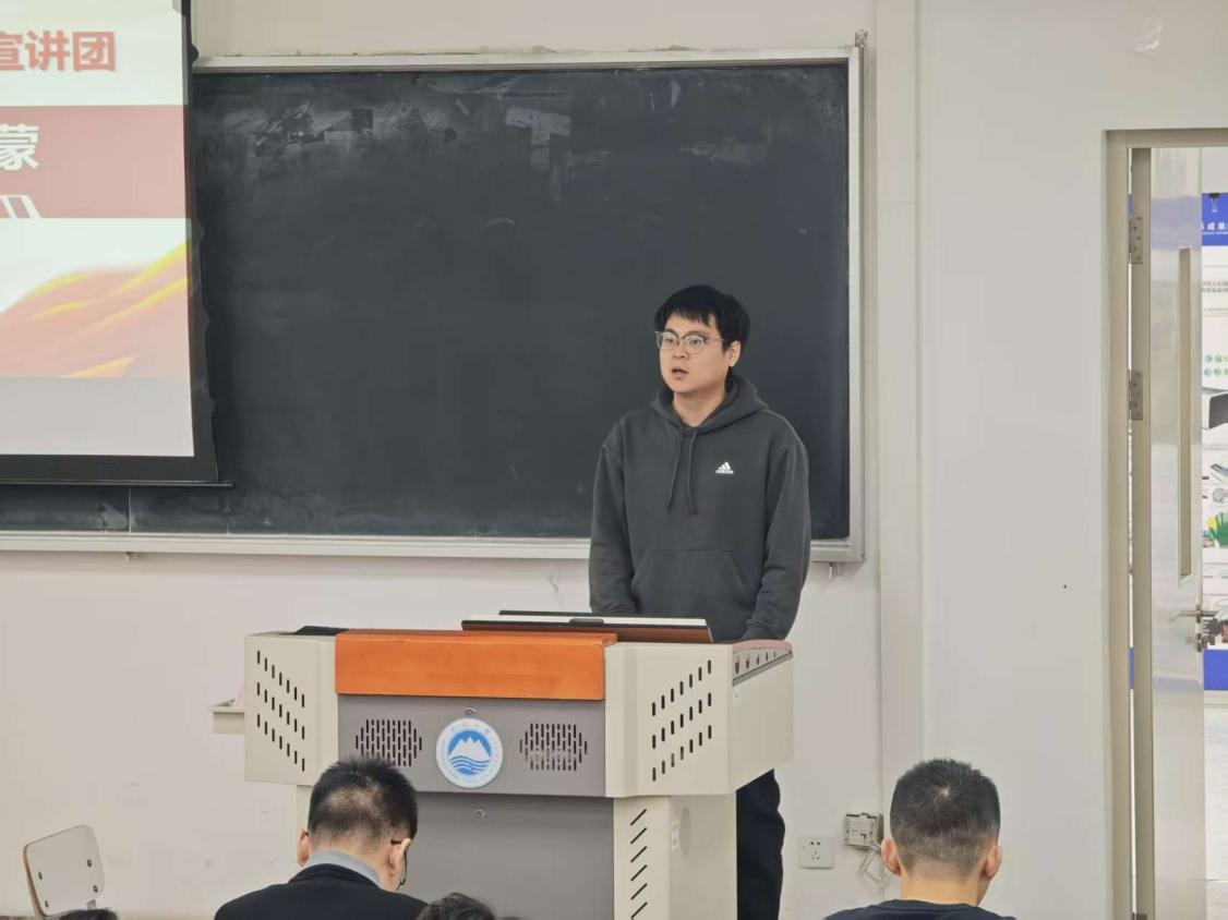 活动中,宣讲团成员结合自身学习实践经历,围绕理想信念、责任担当与红色精神传承等主题进行宣讲。宣讲团成员刘泽阳以“群众思想”为主题,系统阐述了毛泽东群众思想的内涵与时代意义,并结合其在四川支教的亲身经历,生动讲述了理论联系实际、服务群众的实践体会,引导学生党员在实际行动中厚植为民情怀。随后,宣讲团成员陈俊澎以《那栋楼,那束光:一名青年党员的知行答卷》为题,立足自身成长经历,分享了在学业学习与实践锻炼中不断强化党员意识、践行使命担当的思考与体会。他从“知”与“行”的辩证统一出发,阐释了青年党员在专业学习中追求真知、在实践中服务社会的成长路径,展现了新时代青年党员应有的责任意识和行动自觉。宣讲最后,宣讲团成员樊宗昌以《传承沂蒙精神,再看新沂蒙》为题,围绕沂蒙精神“党群同心、军民情深、水乳交融、生死与共”的核心内涵,深入解读了沂蒙精神在新时代背景下的现实意义与时代价值,引导学生党员从红色传统中汲取奋进力量,坚定理想信念。