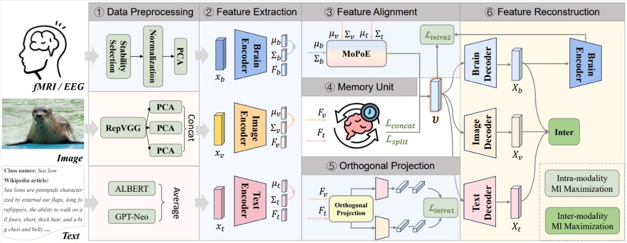 人脑如何理解眼前的图像与文字?这项研究试图让机器也学会这种理解。这篇文章提出了MLHuB(Memory Like the Human Brain)模型,实现了脑电信号-视觉-语言三模态深度对齐。该模型模仿了人类大脑的学习机制,是一种负责读取和更新已学习文本-图像特征的内存单元巩固所学知识的方法;同时,引入了一种正交投影机制来分离共享表征和模态特定表征,并采用互信息最大化来确保跨模态的一致对齐。在多个基准数据集上的测试表明,MLHuB取得了最优性能,并提供了一种更具可解释性和泛化能力的方法来理解大脑如何解码视觉和语言信息。
