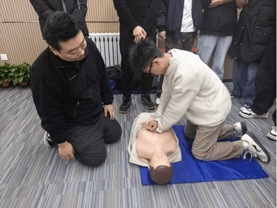 本次培训聚焦心肺复苏(CPR)与自动体外除颤器(AED)使用的核心知识与实操技能。培训中,红十字会讲师系统讲解了应急救护的基本原则、心肺复苏的基础知识、针对成人的心肺复苏完整操作流程以及AED设备的正确使用方法。讲解内容紧扣关键、深入浅出,强调了“黄金四分钟”在心搏骤停现场救援中的决定性作用。