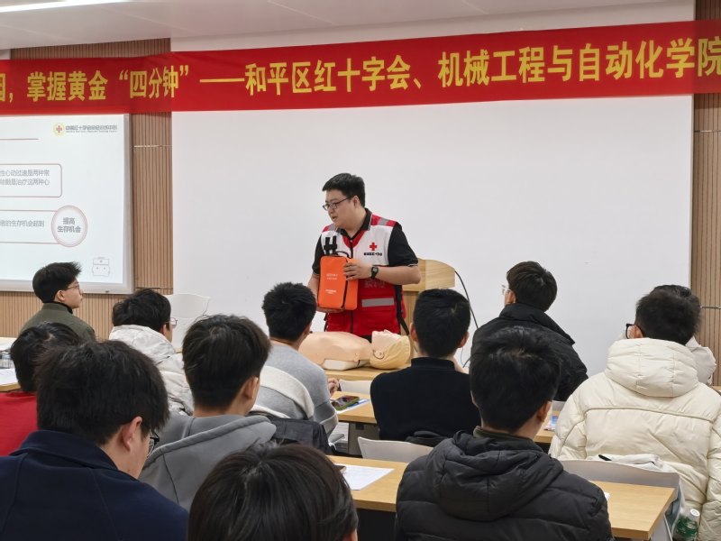 3月11日下午,为深入开展生命教育,切实提升学院师生的自救与互救能力,弘扬新时代雷锋精神,学习金城龙同志的先进事迹,上好意义深刻的“开学第一课”,机械工程与自动化学院特邀和平区红十字会专业培训人员,在学生活动中心200室举办“急救技能进校园,掌握黄金‘四分钟’”应急救护(CPR+AED)培训。学院师生代表参加培训。